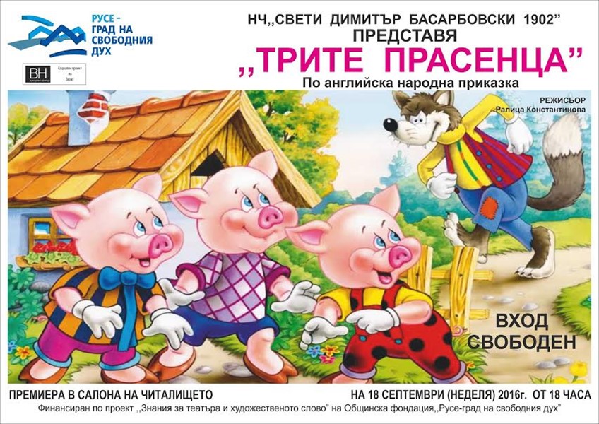 На 18 септември (неделя), от 18:00 часа, на сцената на Народно читалище ,,Свети Димитър Басарбовски – 1902“ – село Басарбово, ще се състои премиерата на постановката „Трите прасенца“.