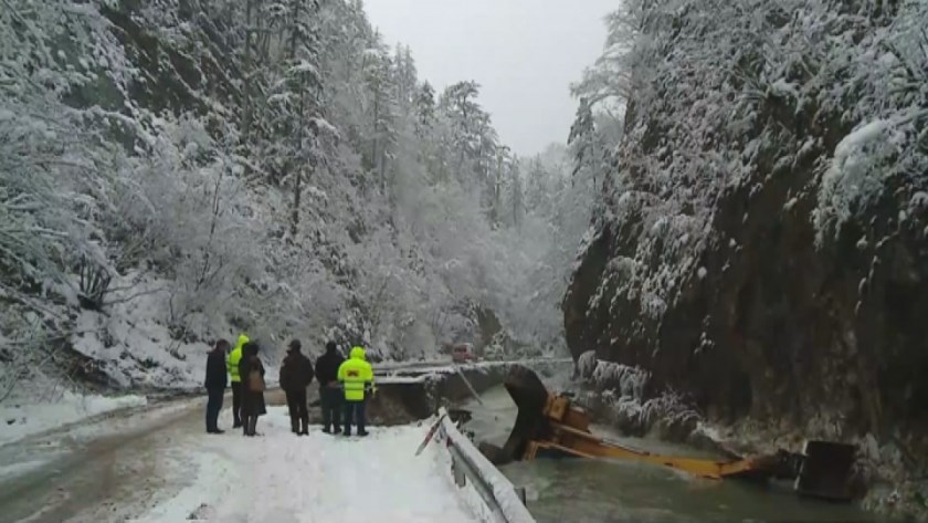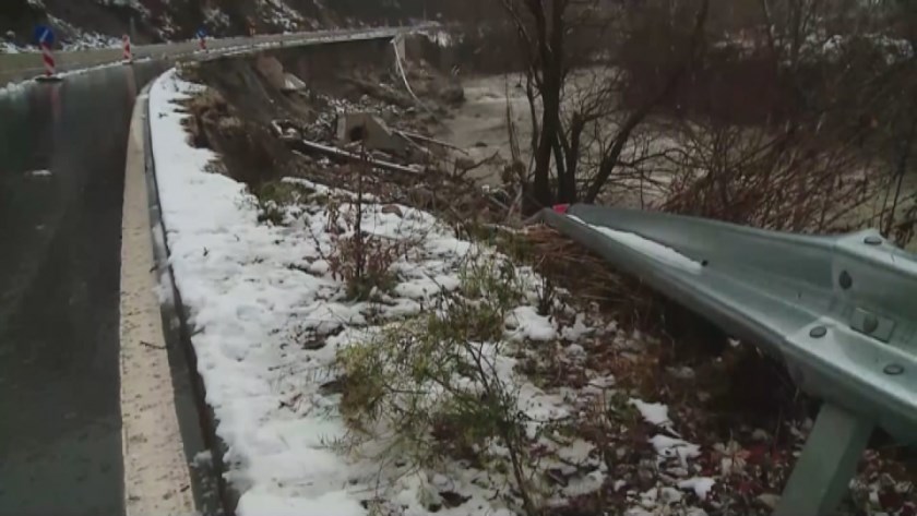 Ситуацията тук се усложни допълнително, защото след тридневно укрепване на пътя подпорната стена отново поддаде и в реката падна работещият на място багер.