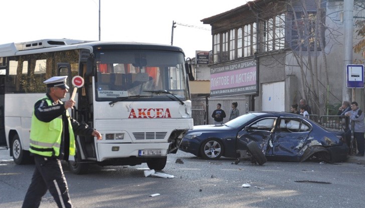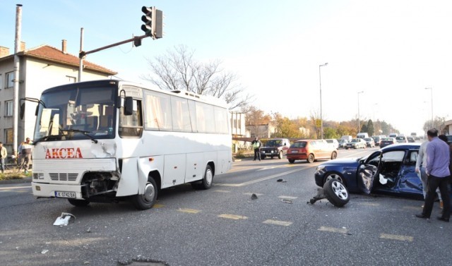 Препълнен с пътници автобус от Кърджали се вряза в завиващо БМВ на кръстовището на хасковския булевард Освобождение в ранния съботен следобед.