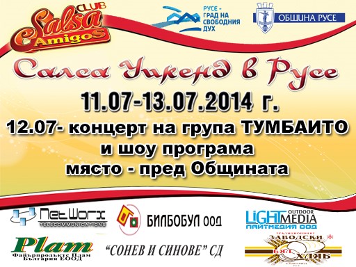 През почивните дни Русе ще се превърне в столица на латино ритмите. От 11-и до 13-и юли в крайдунавския град ще се проведе първият по рода си „Салса уикенд Русе 2014“. Негови организатори са Община Русе и Салса Клуб „Амигос“, а събитието се реализира с финансовата подкрепа на Фондация „Русе - град на свободния дух“. Очаква се латино фиестата да събере повече от 200 любители на танците от 13 клуба от цялата страна. Те ще демонстрират майсторство при изпълнение на салса, бачата и кизомба, включвайки се в уркшопове и салса партита за професионалисти в сградата на Доходно здание.