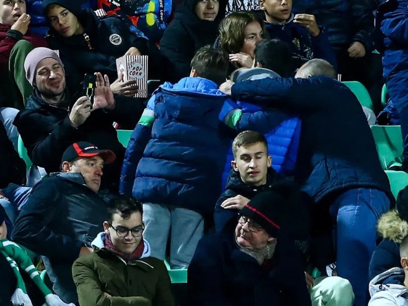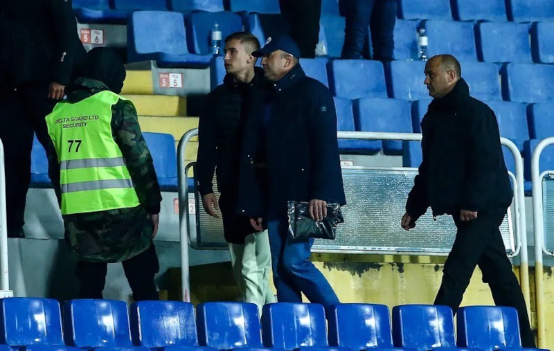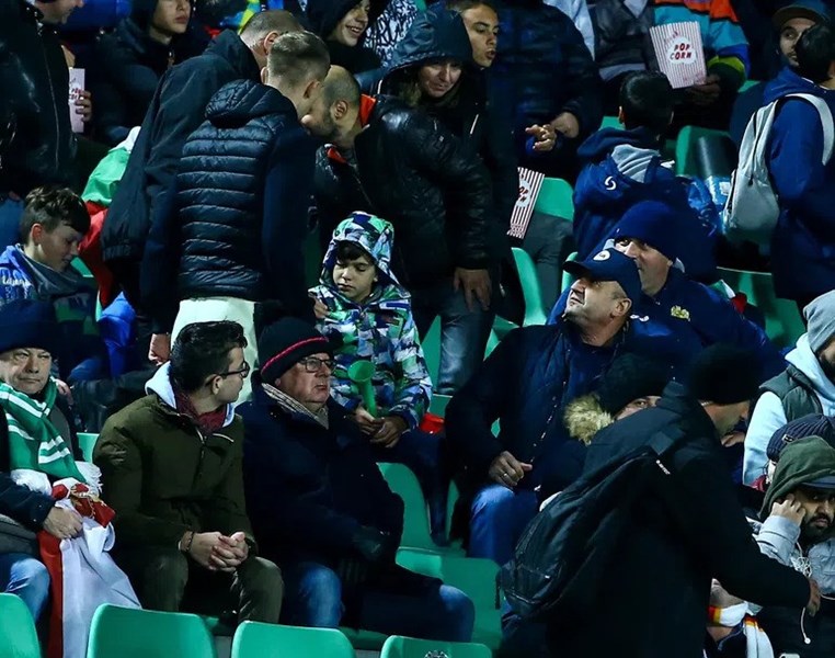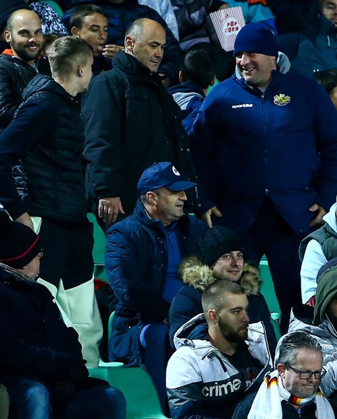 Той е заедно със сина си Георги, като прави впечатление, че не е заел място във ВИП ложата, а гледа от трибуните, под козирката на Сектор “А”. Радев също така не е ангажирал никого от БФС с присъствието си, пише Sportal.bg
