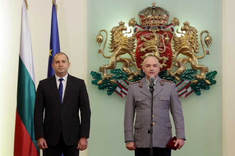 При връчването на пагоните на церемонията днес на "Дондуков" 2 Радев поздрави бригаден генерал Мутафчийски с новото звание и новата длъжност, пожела му здраве, сили и упоритост, за да може да реализира визията си за по-нататъшно развитие на ВМА, която да продължи да бъде и средище за развитие на наука и за подготовка на млади кадри на световно ниво.
