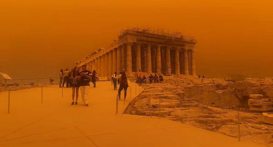 Причината за необичайната гледка са високите нива на сахарски прах, донесени силен средиземноморски циклон, позициониран над Йонийско море, пише MeteoBalkans.