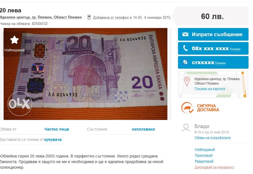 Намерихме я в OLX, докато си търсихме магнитни наколенки от Китай, защото нещо ни въртят колената тази есен. Става въпрос за банкнота от Юбилейна серия 20 лева – 2005 година. В перфектно състояние. Много рядко срещана банкнота. Човекът я продава, защото не му е необходима, се казва в обявата и е много прав.