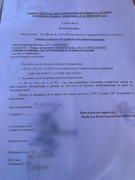 Професор Балтов е уволнен дисциплинарно - това показа заповедта