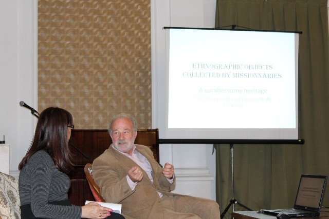 В лекцията си проф. Руег се фокусира върху историческото развитие на Виенската школа по антропология от XIX и началото XX в. Акцентът бе поставен върху колекции от предмети от сферата на етнографията, които са събирани от католици мисионери при посещенията им в екзотични райони, като коренното население на Северна и Южна Америка и Папуа Нова Гвинея.
