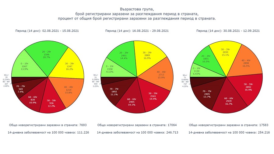 Накрая, картата, за която доста говорих напоследък - картата на заболеваемостта по възрастови групи. Гледате най-лявата фигура и фиксирате частта, която е свързана със заболеваемостта от 0 до 49 години. Сега гледате следващата фигура и виждате как тази част от тортата намалява. В началото на септември намаляването продължава. Що така бе Миме? - да попитам и аз. Да не би делта вариантът да е спрял да атакува младите и се е прехвърлил на старите? Не разбира се.
