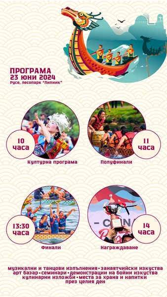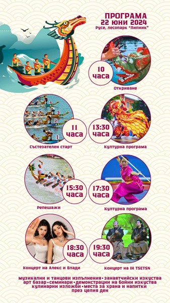 Официалното откриване на Фестивала на драконовите лодки е в 10 ч. на 22 юни (събота), като състезанията е предвидено да се състоят на няколко етапа до 16:30 ч. От 11 до 19:30 ч. в зоната между двете малки езера (под заведение „Овчарска лъка“) ще се проведе богата китайско-българска програма с музикални и танцови изпълнения, творчески работилници, занаятчийски изкуства, арт базар, демонстрации на бойни изкуства, атракции за деца, кулинарни изложби, места за храна и напитки и други забавления.