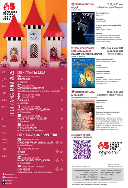 Куклен театър – Русе представя разнообразна майска програма, в която сензационната премиера за възрастни „Гара любов" се откроява като истинско предизвикателство за сетивата. Този новаторски спектакъл поставя зрителите в необичайна ситуация – представлението се провежда в почти пълна тъмнина, а зрящите публика получават превръзки за очите.