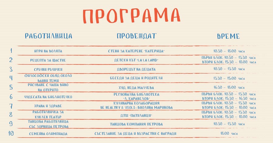 За тази събота (1 юни) те обещават богата програма, която включва пълноценно време в игри, закачки и веселие за цялото семейство. Организатор и автор на събитието е Мисия Градеж, с подкрепата на Община Русе и Общинска фондация „Русе-град на свободния дух“.