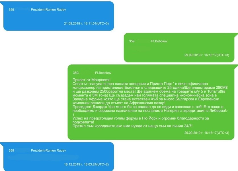 На 29.09.2019 г. в 16:15 ч. Plamen Bobokov изпраща на Prezident - Rumen Radev съобщение с текст: "Привет от Монровия! Сенатът гласува вчера нашата концесия и Приста Порт е вече официален концесионер на пристанище Бюкянън в следващите 25 години!... Президент Джордж Уеа много би се радвал да се види и запознае с теб! Ето защо е необходимо и сериозно назначаване на посланик в Нигерия с акредитация в Либерия! Успех на предстоящия голям форум в Ню Йорк и огромни благодарности за подкрепата! Пратил съм координатите, ако има нужда от нещо съм на линия 24/7!".