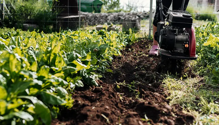 Времето за обработка е критично: почвата трябва да е достатъчно суха, за да не се лепи на фрезите, но и достатъчно влажна, за да не е на прах. Простият тест: вземете шепа земя и я стиснете — ако се разпада на парченца при натиск с пръст, готова е за обработка. Ако остава на топка — изчакайте ден-два.
