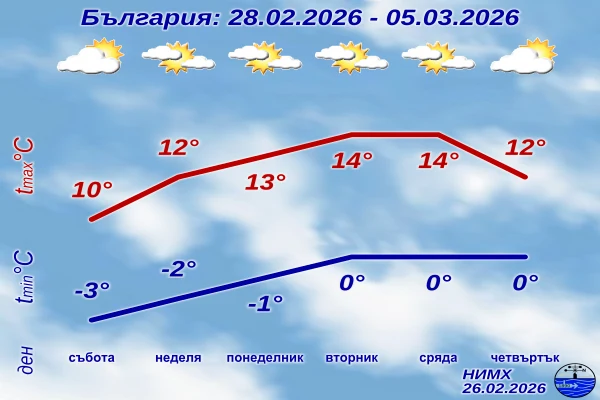 В събота, 28 февруари, облачността над Източна България ще бъде по-значителна, но валежи не се очакват. Вятърът ще бъде слаб до умерен от изток-североизток. Сутрешните часове ще останат хладни с минимални температури между минус 5 и 0 градуса, докато дневните стойности ще варират от 8 до 13 градуса.