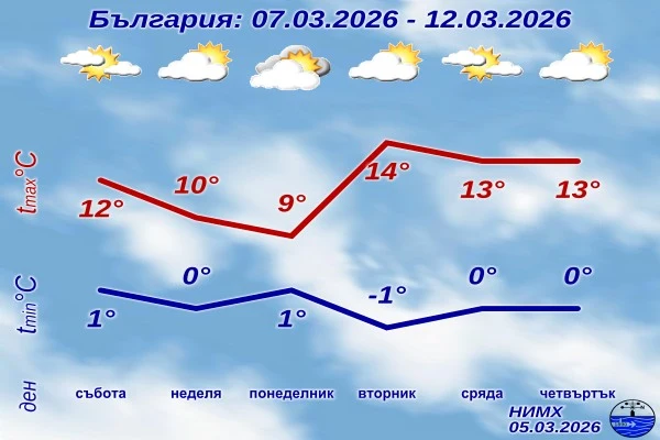 След хладния старт на седмицата, температурите ще тръгнат рязко нагоре. Очаква се дневните стойности да достигнат и дори да надхвърлят 15 градуса в по-голямата част от страната. По-хладно ще се задържи единствено по Черноморието, където заради задържаща се ниска облачност или мъгла термометрите ще отчитат до 10 градуса. Минималните температури през целия период ще варират в тесни граници – най-често между минус 3 и 2 градуса.