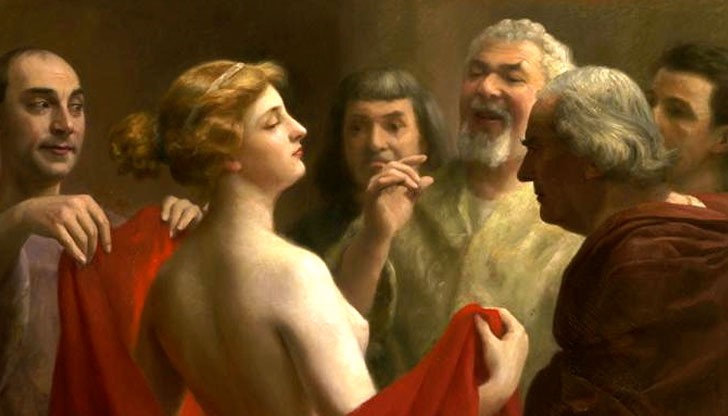 По време на процеса обаче е защитавана от друг свой почитател, който когато разбрал, че губи процеса, разкъсва туниката й, разголвайки гръдта й пред заседателите и така печели както тяхното благоразположение, така и делото.
