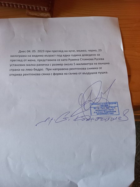 Г-жа Русева прилага и снимка на документ от ветеринарна клиника в Русе, в който пише, че в бедрото на животното е открита сачма. Датата в текста е сгрешена, вероятно поради техническа грешка, но фактите са документирани.
