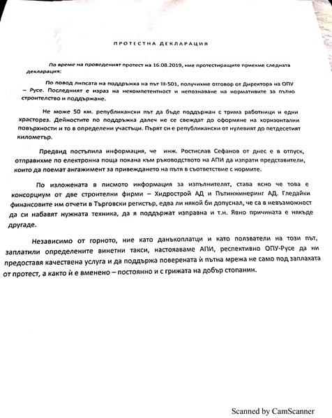 Организаторите на протеста са получили отговор от Директора на ОПУ - Русе, който е "израз на некомпетентност и непознаване на нормативите за пътно стоителство и поддържане", се казва в приета от протестиращите декларация (Можете да я видите в галерията ни).