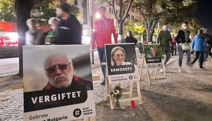 Снимка на българския бизнесмен Емилиян Гебрев е поставена пред руското посолство в Берлин, където има постоянен протест срещу престъпленията на Путин.