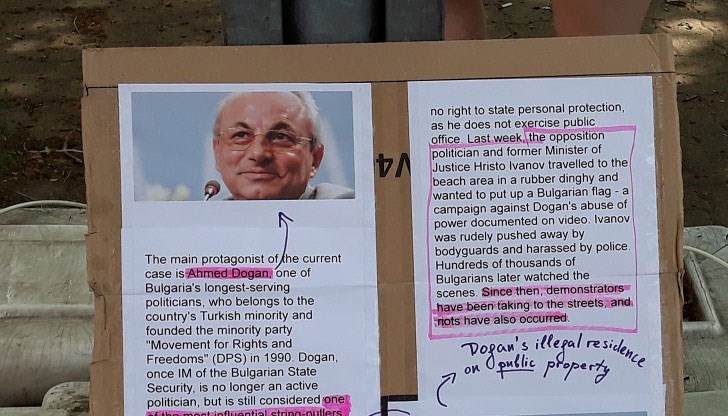 Самоделни табла с надписи на английски обясняваха: “кой е Ахмед Доган и как е окупирал плажа в Росенец, охраняван от служители на НСО“; "кой е Делян Пеевски, окупирал българските медии и отговорен за цензурата в тях, изпратила страната ни в дъното на световната класация за свобода на словото“; "кой е Бойко Борисов, защо миналото му публично се свързва с организираната престъпност, а настоящето с “авторитарен режим, скрит зад проевропейска фасада”, предава Mediapool.bg