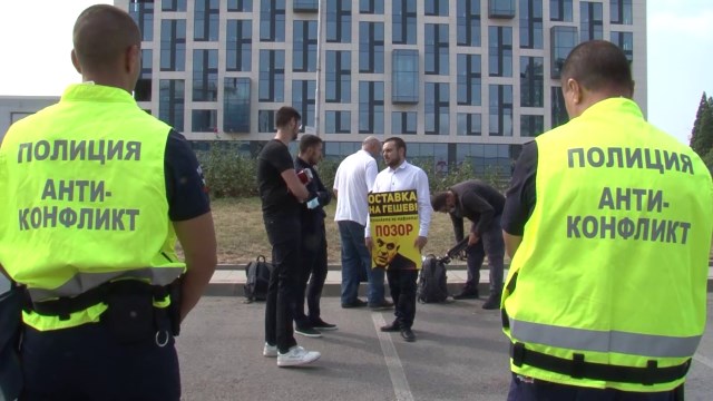 Те носят плакат с надпис „Гешев е позор“, а протестиращите настояват за оставката на ръководителя на държавното обвинение Иван Гешев. Протестът им е мирен, а полицейското присъствие в района е засилено.
