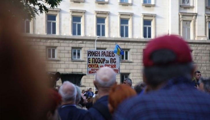 "Фуражка – самальот Масква", "Аз не съм червен, аз съм Румен", "ПРЕZИД-END", гласят протестните плакати. А гражданите скандират: "Тук не е Москва!", "Радев е предател" и "Оставка".