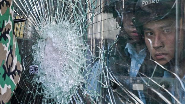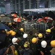 Телевизионен канал в Хонконг излъчи кадри как демонстранти с каски преминават през контролно-пропусквателен пункт и продължават като разбиват метални врати, за да се опитат да достигнат по-навътре в сградата.