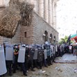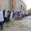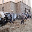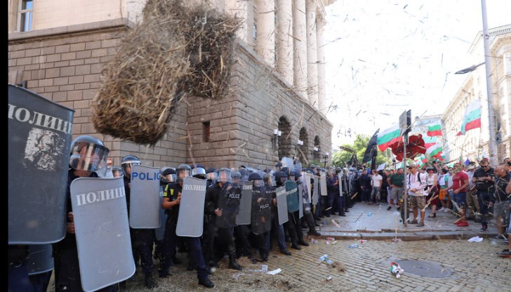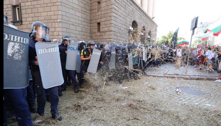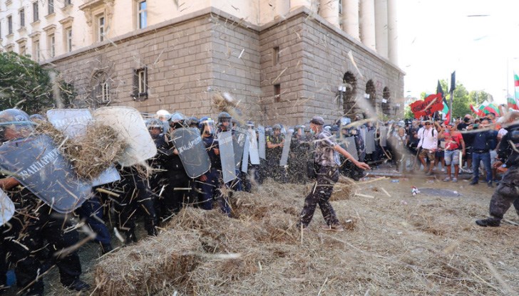 Протестиращи струпаха бали сено на жълтите павета пред сградата на Народното събрание.