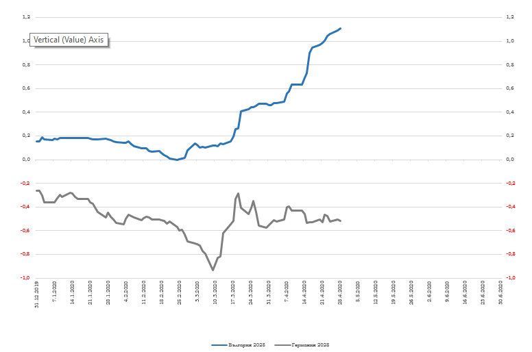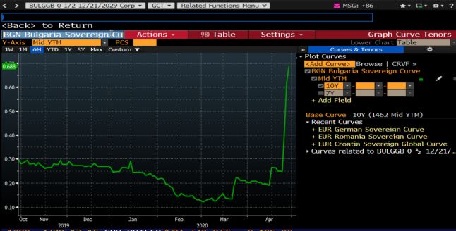 Веднага след като ЕЦБ и Българската народна банка (БНБ) обявиха договорения суап линия до 2 млрд. евро на 22 април, доходността по българските държавни облигации се е повишила, тоест цената на дълга на страната е нараснала, показва справка в системата за финансова информация "Блумбърг". Доходността се е покачила повече от двойно – до 0.67%. Расте и рисковата премия по българските облигации спрямо германските държавни ценни книжа, което според анализатори се дължи както на коронакризата, така и на договорения суап, пише Mediapool.bg.