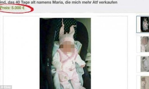 „Дете, на 40 дни, на име Мария... продава се”, пише в обявата, за която се предполага, че е пусната от Дуисбург. Тя е придружена и от няколко снимки на детенцето.