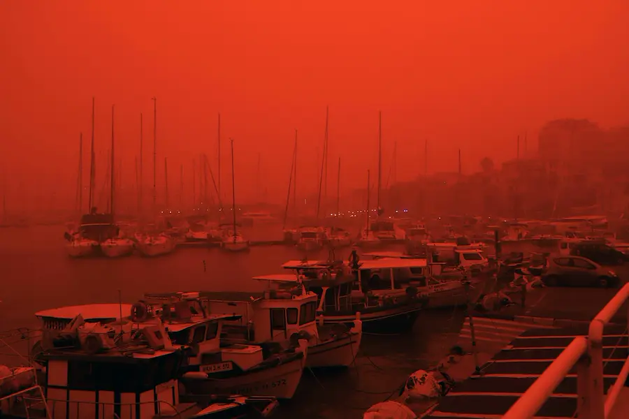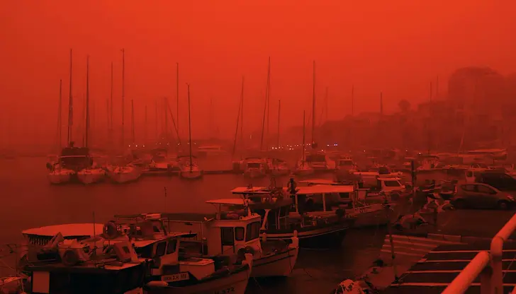 Вълната от африкански прах, пренасяна от мощния циклон "Ерминио", предизвика сериозни смущения във въздушния и морски трафик на гръцкия остров Крит. Явлението драстично намали видимостта до под 1000 метра, принуждавайки властите да пренасочат ключови пътнически самолети и да спрат движението на фериботите, съобщава гръцкото издание "Катимерини".