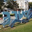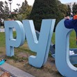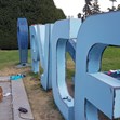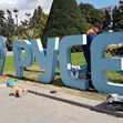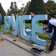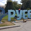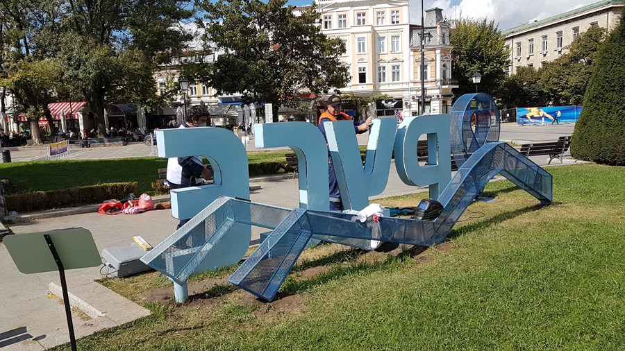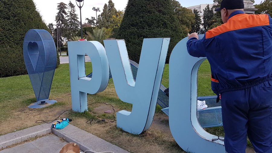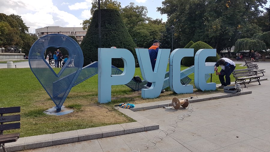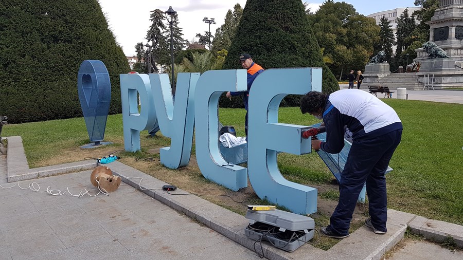 Работници стържат ръждата от новия надпис "РУСЕ"
