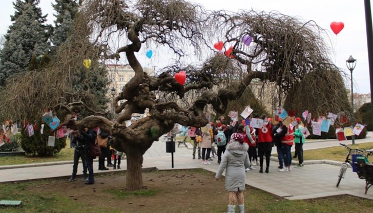 Естествената кулминация на арт инициативата бе днес от 14:30 ч., когато Дървото на влюбените /пред Доходното здание/ “разцъфна" с направените от участниците валентинки.