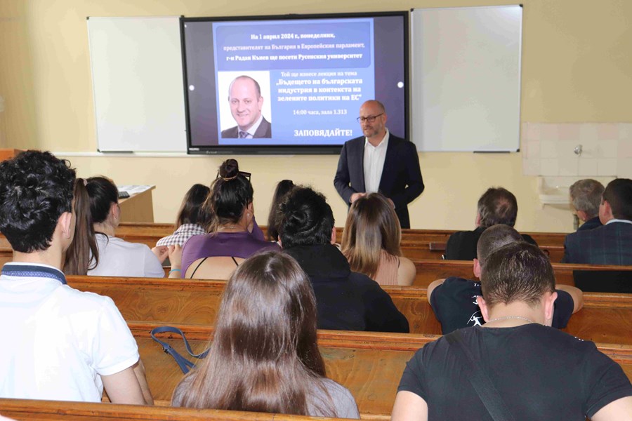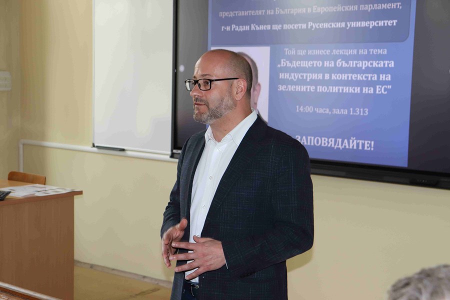 Евродепутатът Радан Кънев беше гост-лектор пред студенти от Русенския университет „Ангел Кънчев“. В рамките на повече от час и половина той разговаря с възпитаници на учебното заведение относно бъдещето на българската индустрия в контекста на зелените политики на Европейския съюз. Радан Кънев беше гост на висшето учебно заведение в качеството си на член на Комисията по обществено здраве, околна среда и безопасност на храните в Европейския парламент. В лекцията участваха областният управител Данаил Ковачев, както и преподаватели от университета. Сред тях бяха деканите на факултетите по природни науки и образование проф. д-р Велизар Павлов, както и на аграрно-индустриалния доц. д-р Калоян Стоянов.