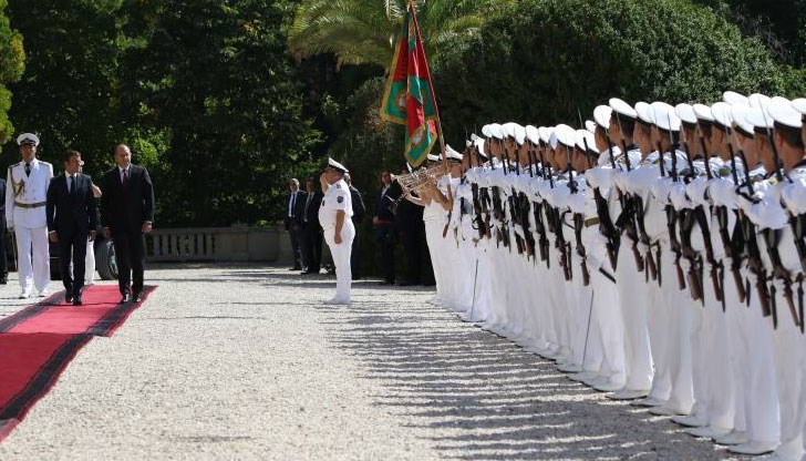 Двамата президенти направиха преглед на почетната гвардейска рота. Бяха изсвирени химните на двете страни, след което Радев и Макрон представиха двете делегации, които ще участват в преговорите.