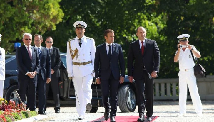 Българският президент Румен Радев посрещна френския президент Еманюел Макрон на официална церемония в двореца „Евксиноград“ във Варна.