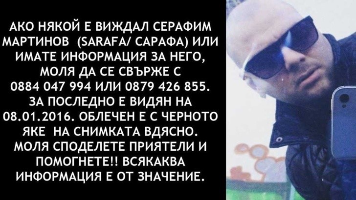 В социалните мрежи близките му разпространиха фотоколаж с две снимки на Сарафа – на едната той е облечен с черно яке, с което е бил облечен и когато е видян за последно на 8 януари.