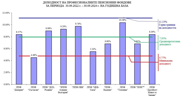 УПФ "ДаллБогг Живот и Здраве" постига най-висока доходност от 10,08% за периода между 30 септември 2022 година и 30 септември 2023 година. След него се нареждат УПФ "Топлина" с 9,76% и УПФ ОББ с 9,20%. Пенсионните фондове "Доверие", "ДСК - Родина" и "Алианц България" също отбелязват значителен ръст с над 8% доходност. Средната претеглена доходност на всички фондове достига 8,35%, надвишавайки минималната изискуема от КФН стойност от 5,01% на годишна база.