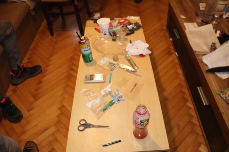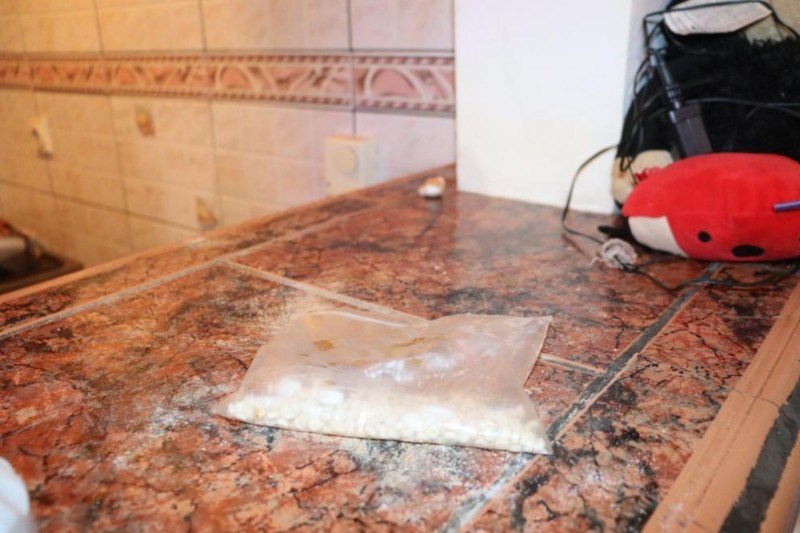 Полицаите са намерили четири полиетиленови плика и пласмасова бутилка, съдържащи бяло кристалообразно вещество (метамфетамин) с общо тегло около 150 гр., множество прекурсори и материали, служещи за производство на високорисково наркотично вещество ( метамфетамин). Иззети са множество бутилки с течност със силна задушлива миризма на ацетон, стъклени колби, фунии, таблетки, червен фосфор, вентилатор и стъклен капак със засъхнало кристалообразно вещество, реагирало при направения полеви наркотест на метамфетамин.