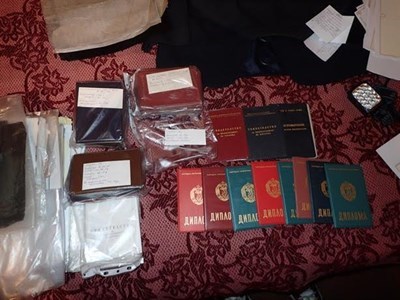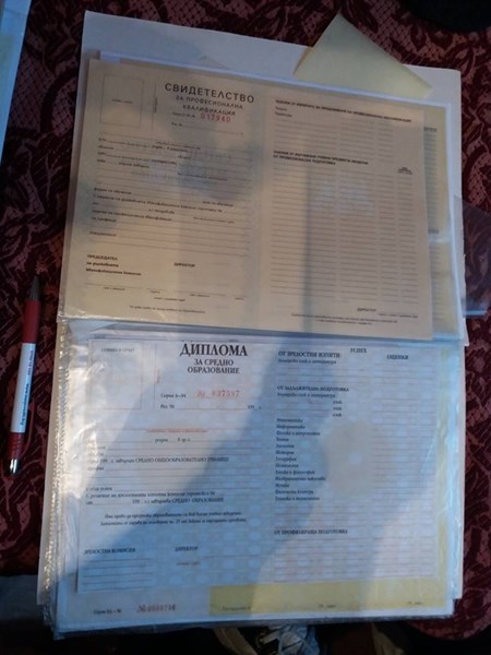 От адреса са иззети: пишещи машини; скенер; ксерокс; ламинатор; метална преса; множество дипломи, свидетелства и удостоверения за завършено основно, средно, висше образование и професионална квалификация; шофьорски книжки; корици на дипломи и копия от бланки на документи; бележки с лични данни на лица, учебни заведения, населени места; метални форми с изобразени на тях букви и цифри; метални плаки- заготовки; ксерокопия на документи за самоличност; печати на учебни заведения вкл. и нотариални, както и заготовки за такива.