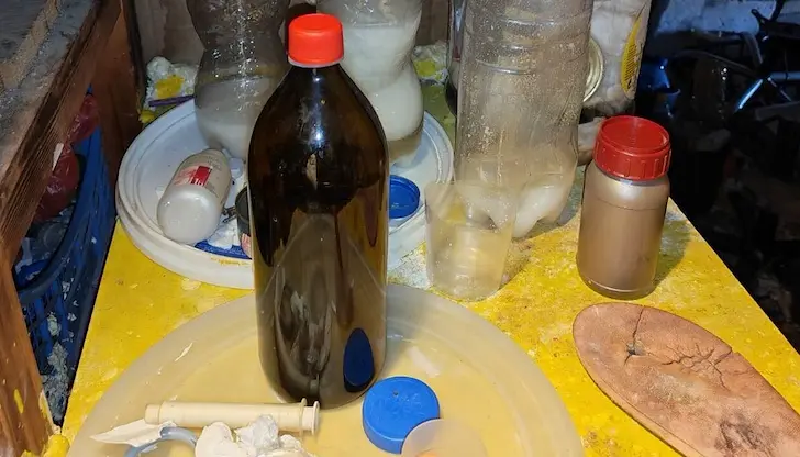 Полицейските екипи са извършили претърсване в дома на мъжа, намиращ се на улица "Юбилейна" в бургаския комплекс "Меден рудник". На адреса униформените са се натъкнали на пълно оборудване и специализирани прекурсори, използвани за синтез на метамфетамин.