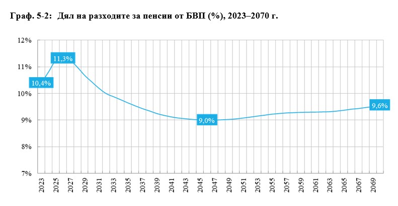 За намаляване на разходите за пенсии след 2026 г. влияние ще оказват няколко фактора, се изтъква в анализа. Броят на пенсионерите ще намалява и по демографски причини, и заради по-строгите условия за придобиване право на пенсия. Успоредно с това средният осигурителен доход ще изпреварва като ръст средната пенсия заради механизма, който се прилага за осъвременяване на пенсиите. Разходите ще намаляват и заради общото намаляване на пенсиите на лицата, които са се осигурявали и във втори стълб. Тенденцията надолу ще продължи до периода 2042-2050 г., когато плащанията по това перо ще достигнат най-ниско ниво от 9%, след което се очаква ръст до 9,6% в края на изследвания период – 2070 г.
