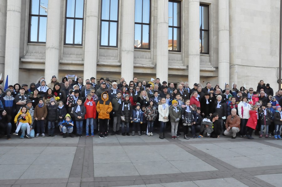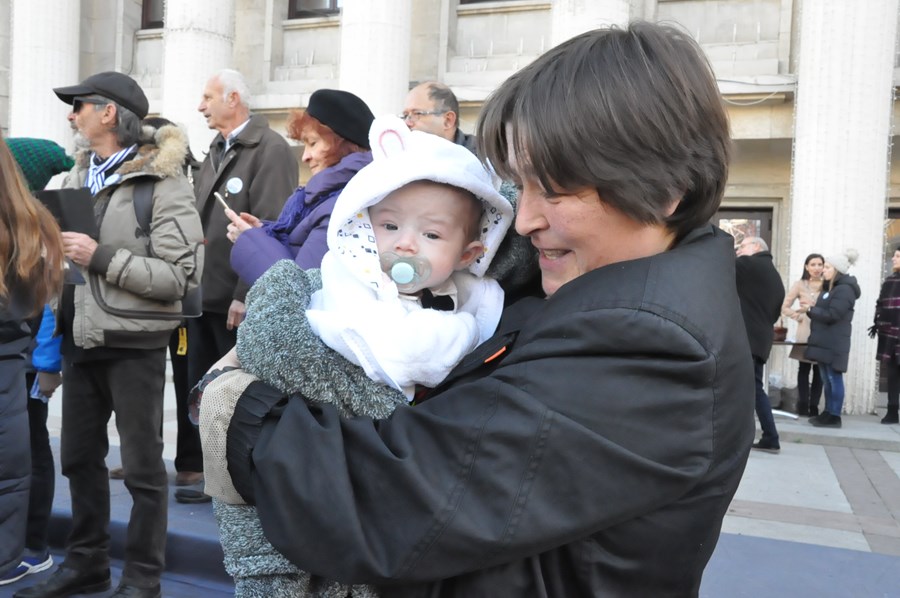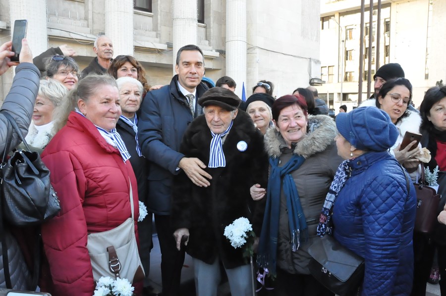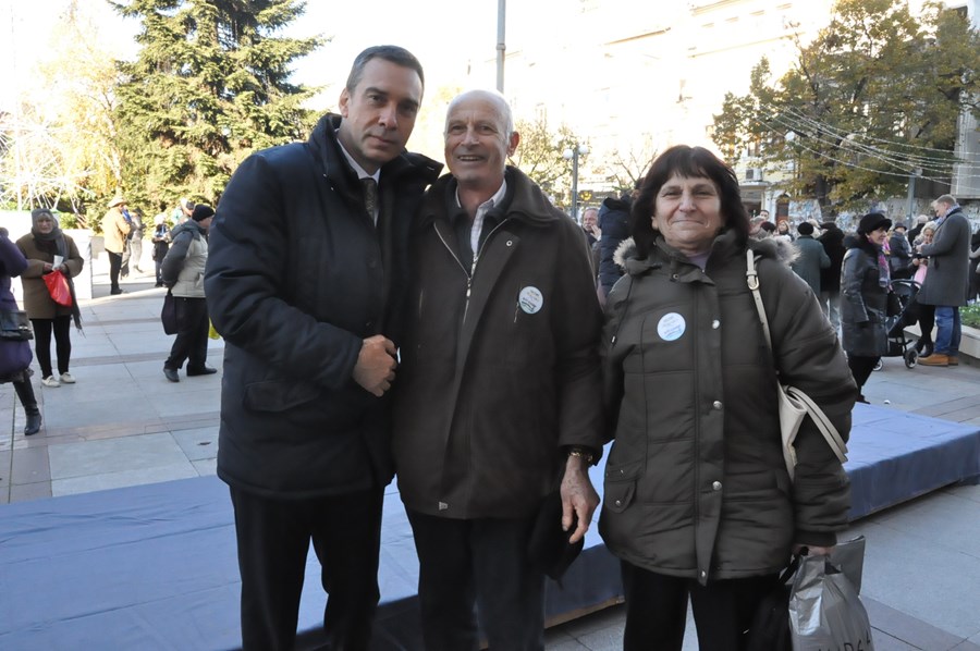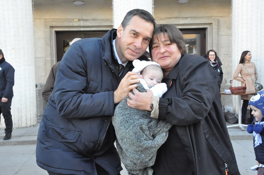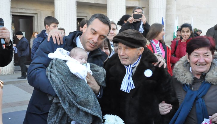 Кметът Димитър Николов събра на обща снимка за историята на площад "Атанас Сиреков" именици със 102 години разлика. Това са почти 102-годишния дядо Никола Мечев от к-с "Меден рудник" и едва 2-месечното бебе Николай.
