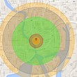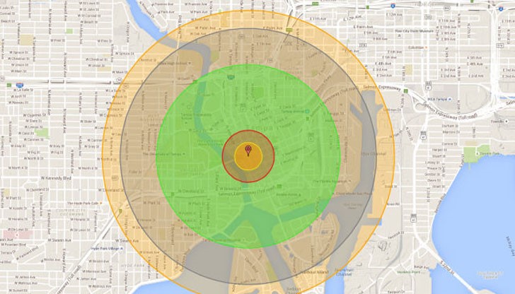 След това следва сив радиус, който показва до къде се простира ефекта на отслабващата въздушна вълна. Най-външният кръг, който е жълт, показва обсега на термалната радиация, която би довела до изгаряния трета степен по човешката кожа.