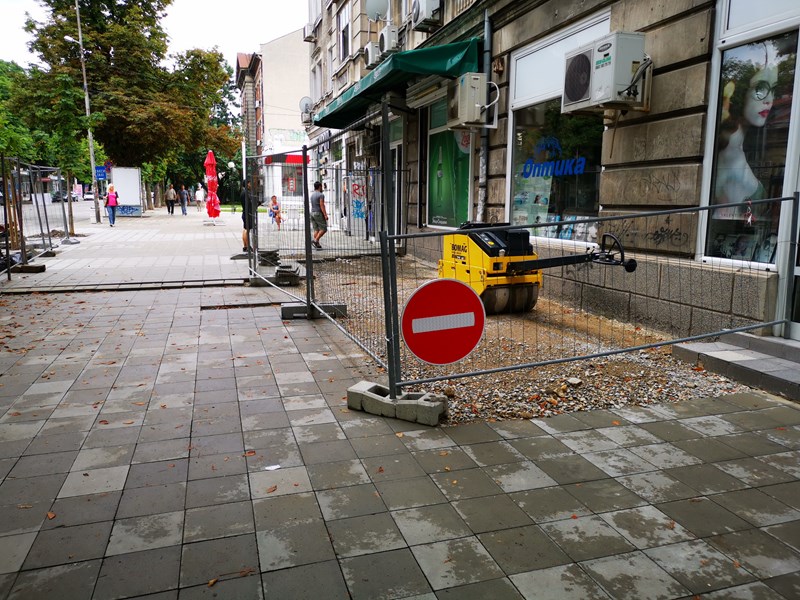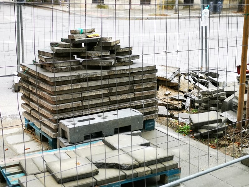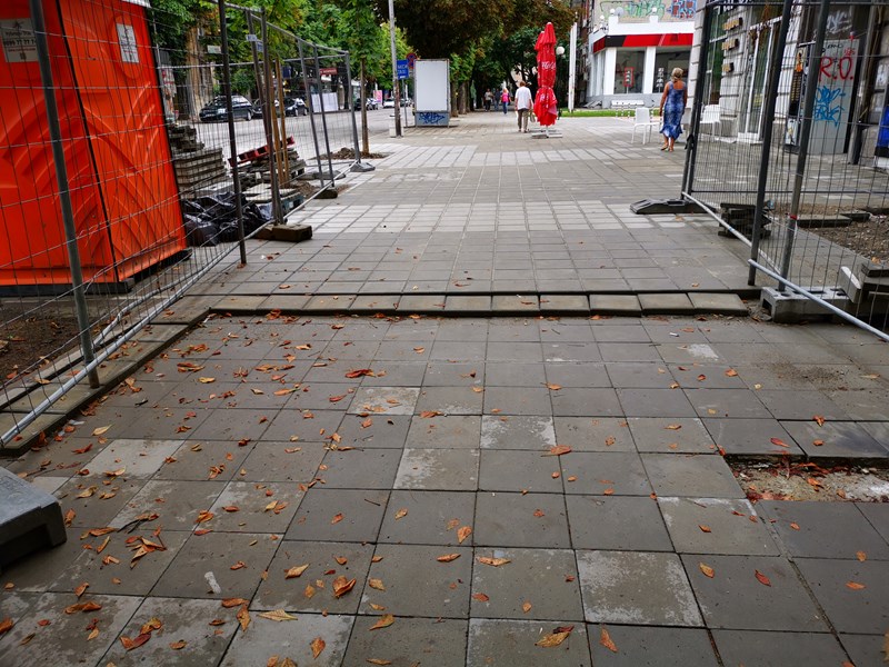 На много места в града не се ремонтират тротоарите, на други места изсипаха грозен асфалт, но в централната част се подменят здрави плочки с нови и то на два реда, защото качеството на материалите е такова.