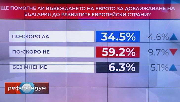 34,5% са на мнение, че приемането на единната европейска валута по-скоро ще помогне за това да сме по-близо до развитите страни. 59,2% обаче отговарят с "по-скоро не", а 6,3% нямат мнение.