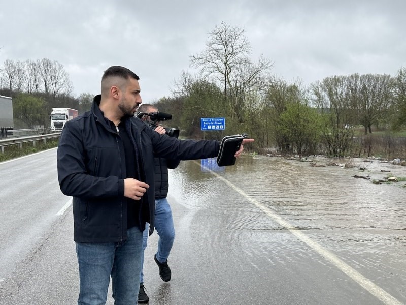 Заради съществуващ риск от аквапланинг, временно в участъка е поставен предупредителен знак за повишено внимание и опасност на пътя.