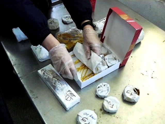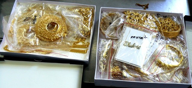 Според първоначална експертна справка артикулите представляват златни бижута от 14-каратово злато, с обща стойност по цени на едро над 2,2 милиона лева.
