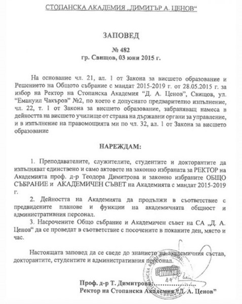 "Преподавателите, служителите, студентите и докторантите да изпълняват единствено и само актовете на законно избраната за РЕКТОР на Академията проф. д-р Теодора Димитрова и законно избраните ОБЩО СЪБРАНИЕ и АКАДЕМИЧЕН СЪВЕТ на Академията с мандат 2015-2019 г."