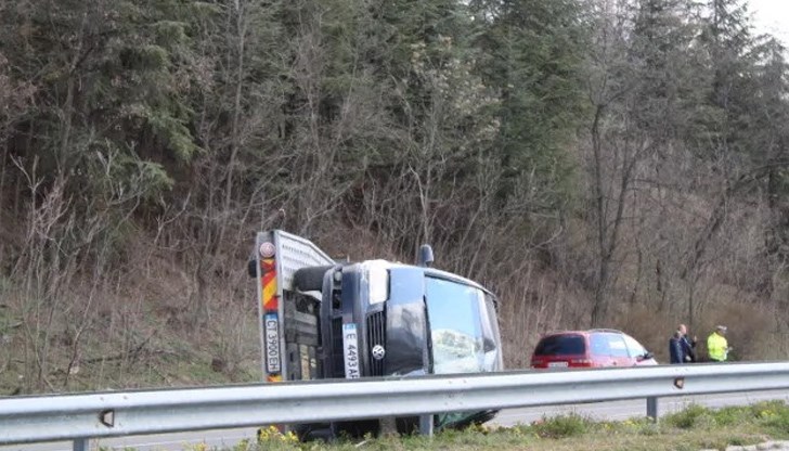 Ремарке, превозващо лек автомобил, се откъсна от теглича и се обърна на международен път Е-79 на изхода на Благоевград в посока пътен възел Рилци - Бело поле.