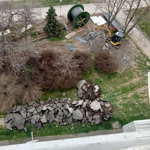 Вместо да бъде възстановена и облагородена, междублоковата градинка в момента се използва като удобно сметище за изхвърляне на строителен боклук. Парчета асфалт, бетон и изкопна пръст са струпани директно върху земята, вместо да бъдат извозени в специализирани контейнери, както изискват наредбите.